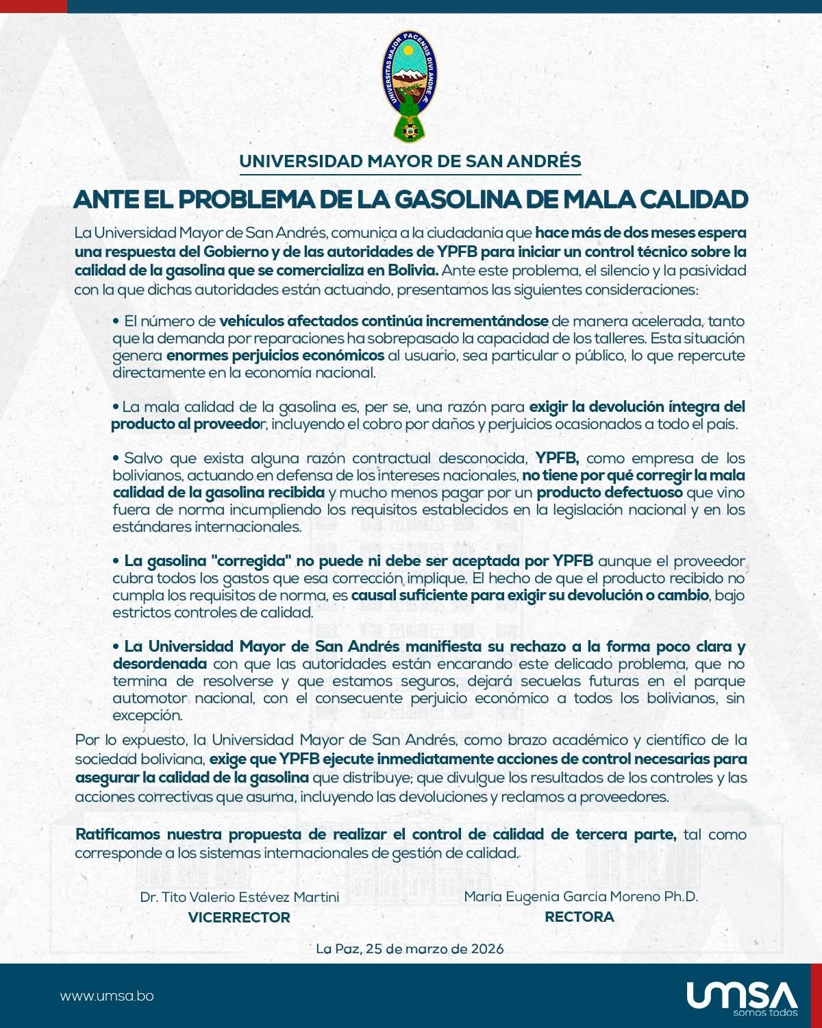 Ante la falta de respuestas por parte del Gobierno y YPFB tras más de dos meses de espera, la Universidad Mayor de San Andrés (UMSA) emitió un pronunciamiento oficial sobre la problemática de los combustibles en Bolivia: