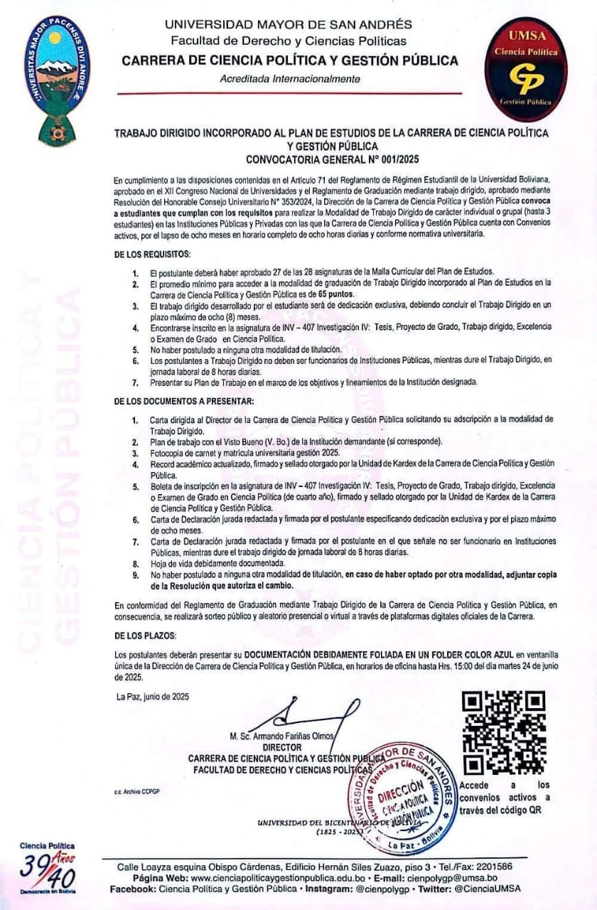 Trabajo Dirigido incorporado al plan de estudios de la Carrera de Ciencia Política y Gestión Pública
