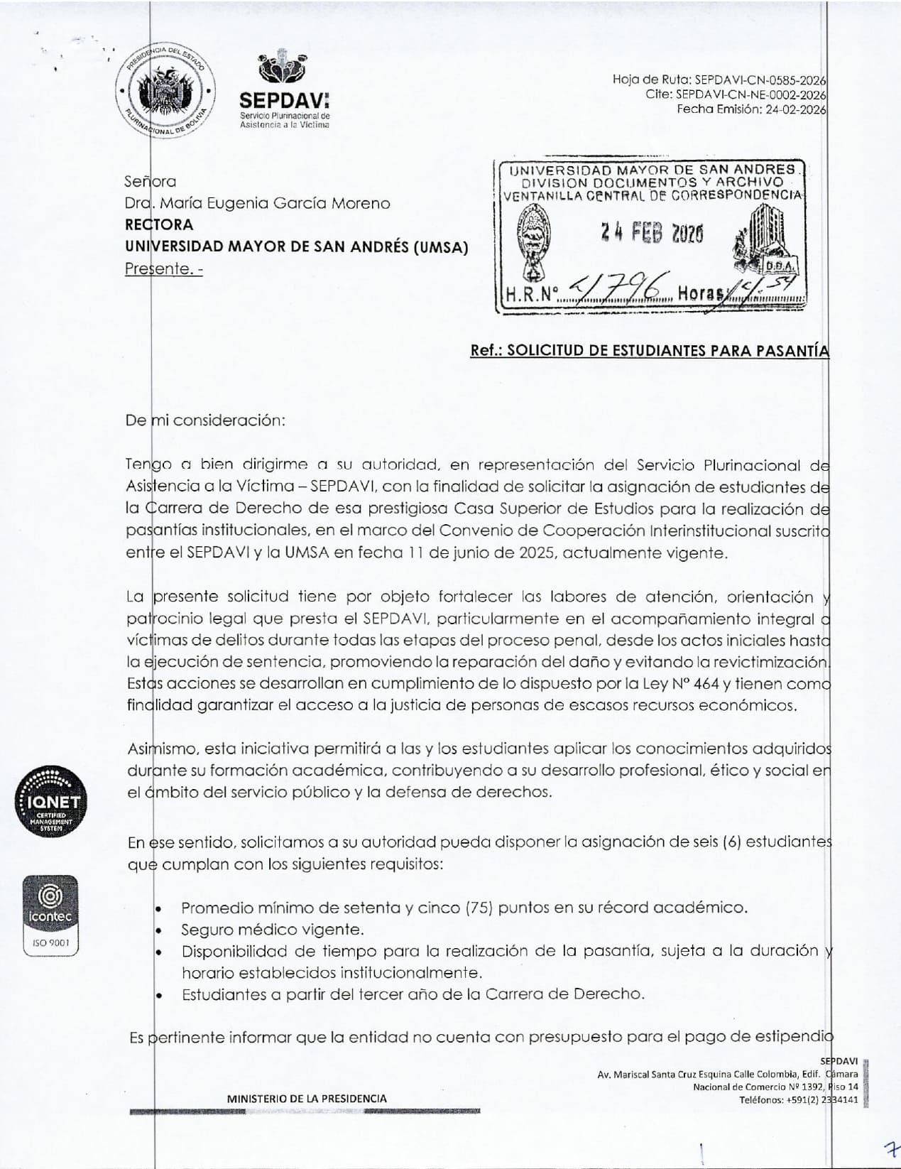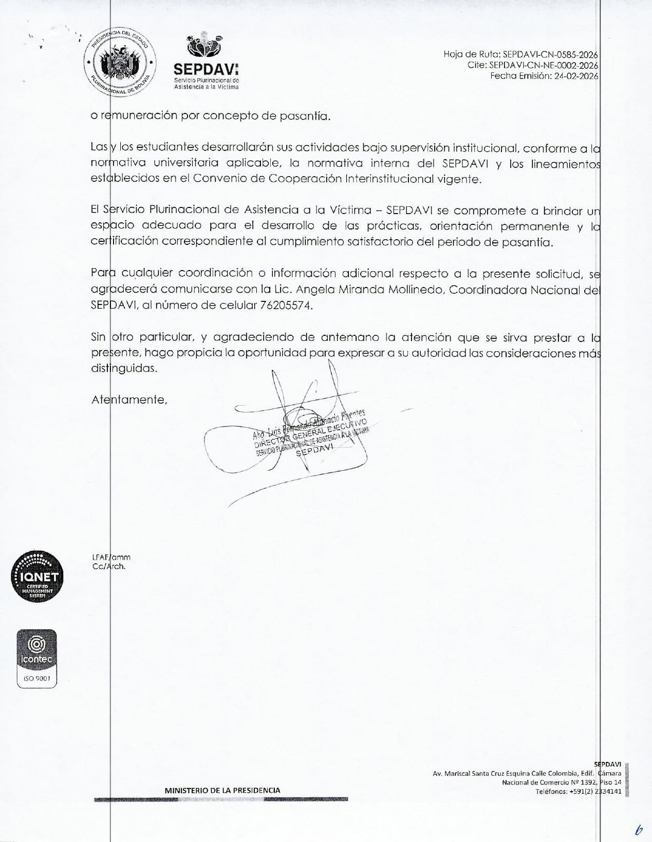 El Servicio Plurinacional de Asistencia a la Víctima – SEPDAVI, abre la convocatoria para dar inicio a prácticas laborales dirigida a estudiantes de la Carrera de Derecho.