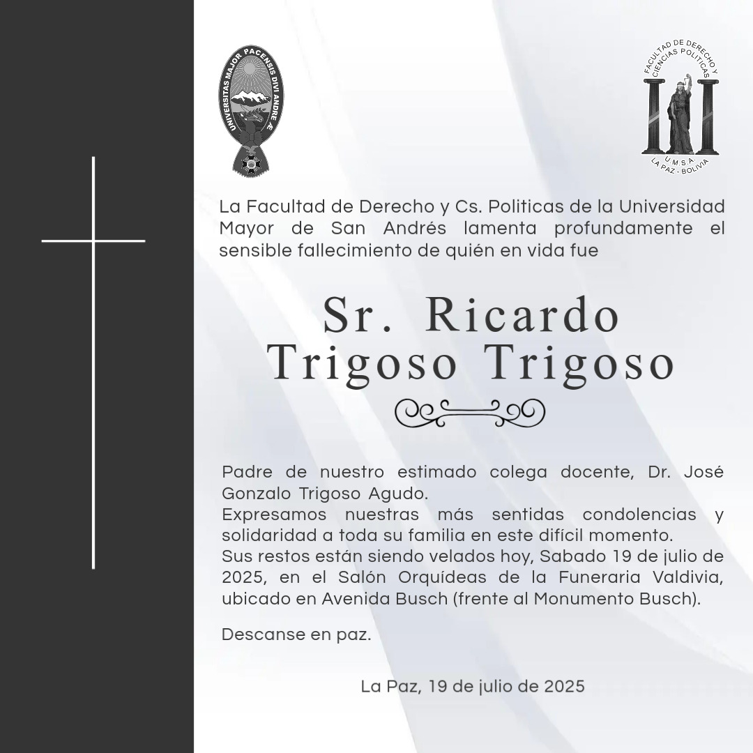 La Facultad de Derecho y Ciencias Políticas de la Universidad Mayor de San Andrés, lamenta profundamente el sensible fallecimiento de quien en vida fue: