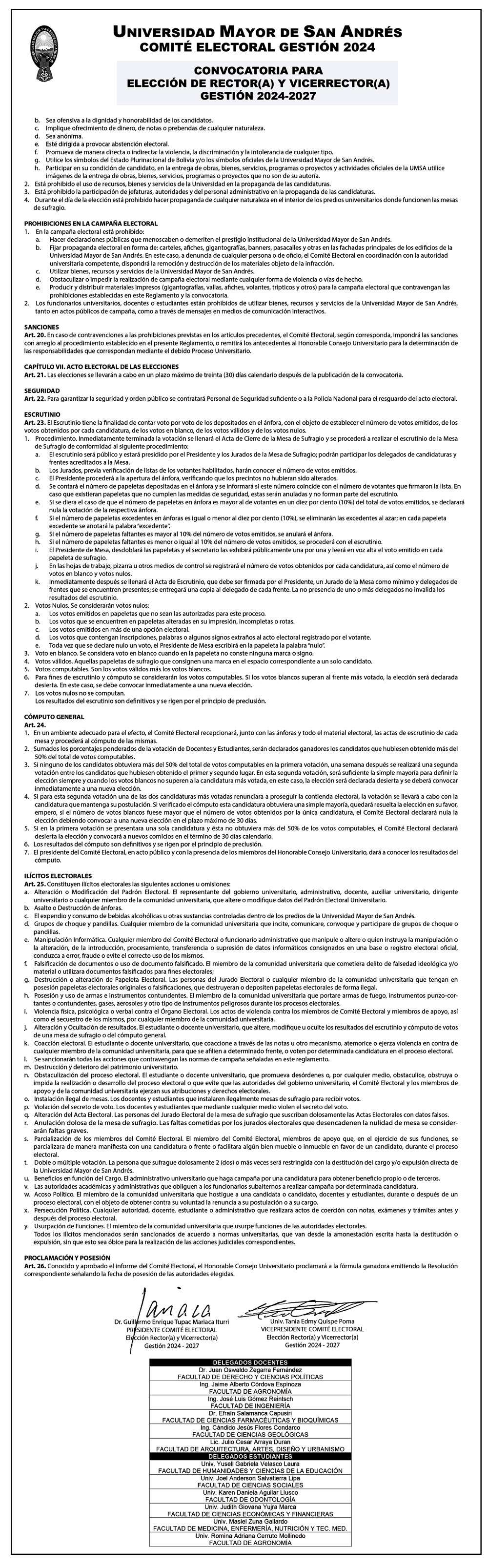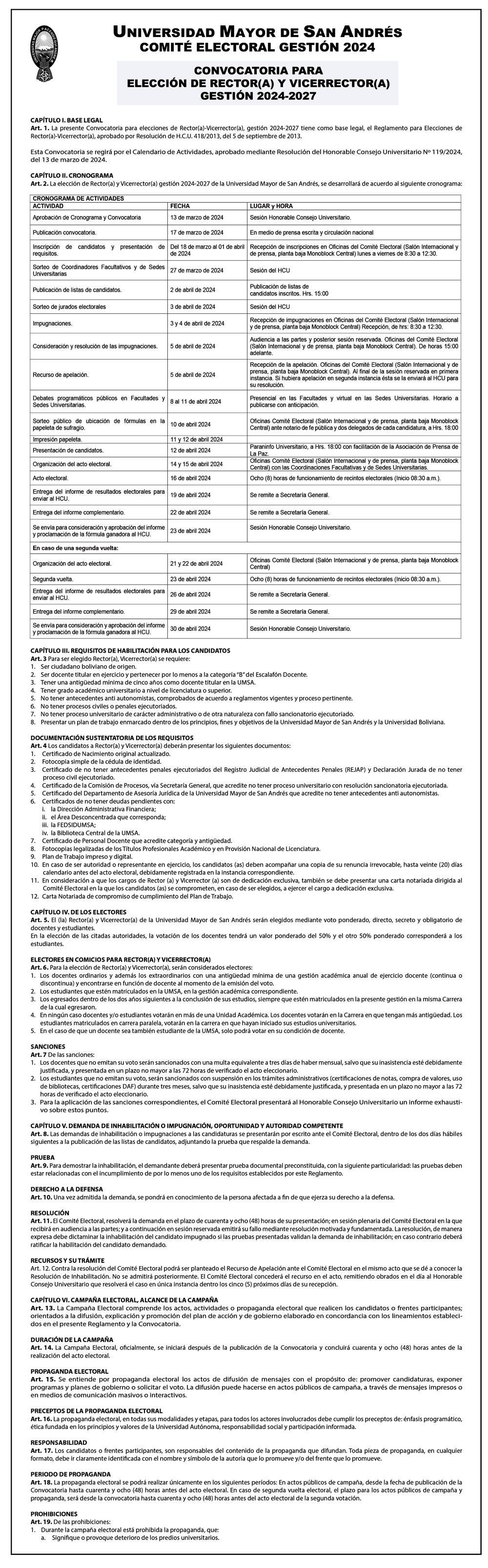 El Comité Electoral de la Universidad Mayor de San Andrés convoca a Elecciones para elegir a las nuevas autoridades de nuestra casa de estudios superiores: Rector(a) y Vicerrector(a), gestión 2024 – 2027. Fecha de la elección: Martes 16 de abril de 2024